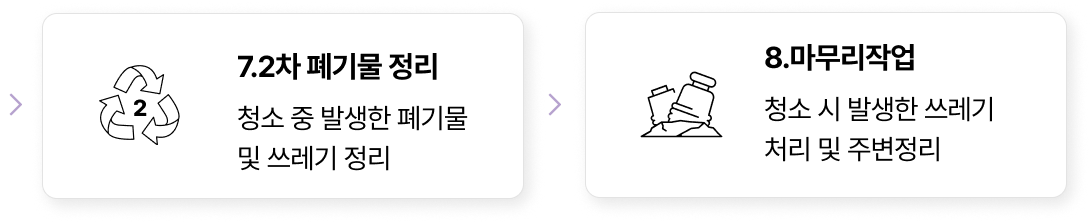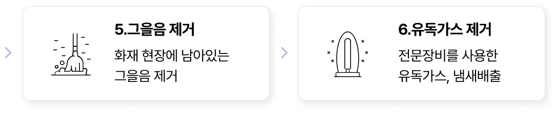 화재청소는 화재가 발생한 건물구조물이 입은 손상의 복구를 돕기 위한 특수청소 서비스입니다. 특히 화재 시 발생하는 그을음, 유독가스와 같은 발암물질은 인체에 유해하기에 화재청소 전문업체를 통해 신속하고 정확하게 복구작업을 하는 것이 매우 중요합니다. 피케이클래스의 화재청소 서비스는 화재 현장에 남아있는 각종 폐기물과 화재 잔여물을 처리하고 전용세척제와 전문장비를 사용해 그을음을 제거하고 유독가스를 배출합니다. 더불어 건물 내외부 청소와 주변정리를 통해 화재현장이 빠르게 본래 모습을 찾을 수 있도록 합니다.