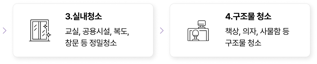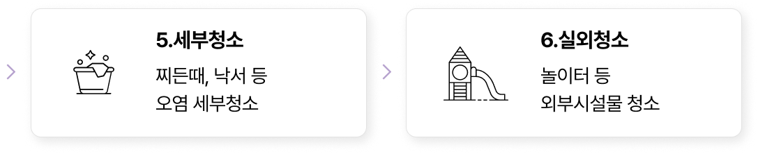 학생들과 어린이들이 하루 중 가장 많은 시간을 보내는 공간으로 눈에 보이지 않는 먼지와 세균에 노출되어 있습니다. 또한 많은 인원이 단체생활을 하는 공간인 만큼 아무리 청소를 해도 금새 또 지저분해집니다. 친환경 약품을 사용하여 눈에 보이는 곳은 물론이고 구석구석 숨은 공간까지 완벽하게 청소하여 면역력이 약한 아이들이 건강하게 생활할 수 있는 쾌적한 교육환경을 제공합니다. 전문 장비로 놀이터 청소, 모래 살균 및 장난감 별도 세척작업도 진행 가능합니다.
